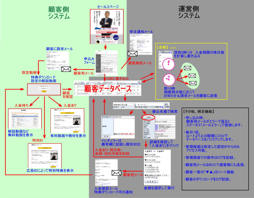 届いたメールをサーバーの設定で本システム用メアドに転送しておくことで、メール送信者のメールアドレスが、どんどんCSVリストとして貯まってゆくシステムです。 |